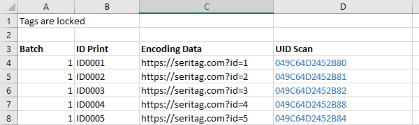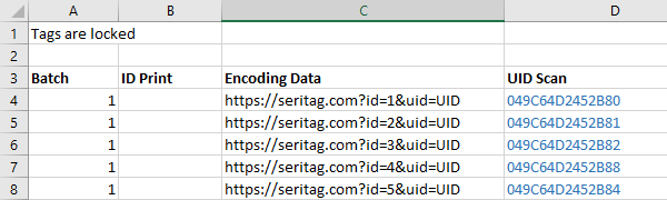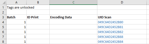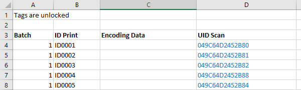 This example would be ordered online with 'Variable Encoding', 'UID Scan' and 'ID Print'. You would upload the spreadsheet to us with the ID print and encoding data and we would complete the UID scan highlighted in blue and send the file back to you. As you are ordering encoding, remember to indicate clearly on the spreadsheet whether the tags are to be locked or unlocked.